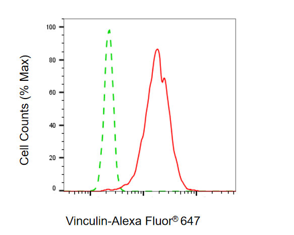 Flow cytometric analysis of Vinculin expression in HT-1080 cells using Vinculin antibody. Green, isotype control; red, Vinculin.