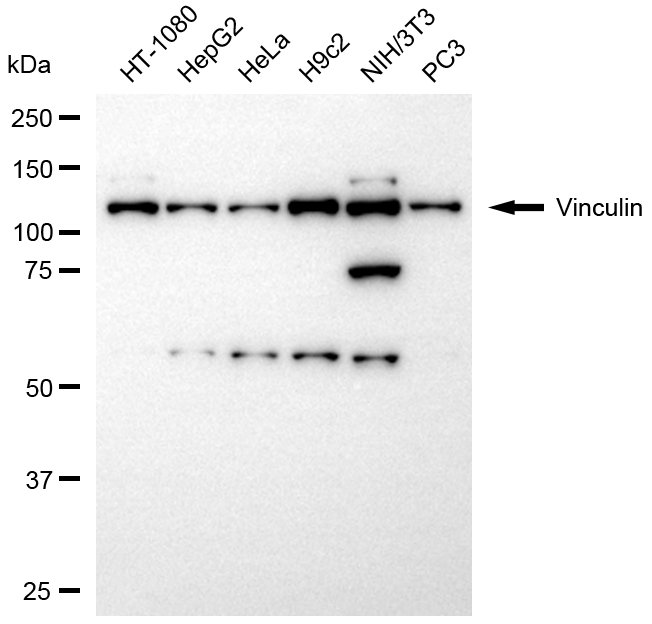 Western blotting analysis using vinculin antibody. Total cell lysates (20 μg) from various cell lines were loaded and separated by SDS-PAGE. The blot was incubated with vinculin antibody and HRP-conjugated goat anti-rabbit secondary antibody respectively.
