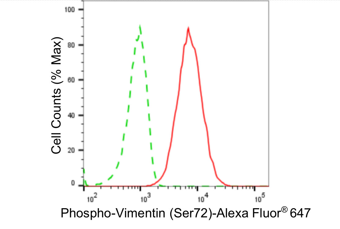 • Flow cytometric analysis of Phospho-Vimentin (Ser72) expression in HT-1080 cells using Phospho-Vimentin (Ser72) antibody. Green, isotype control; red, Phospho-Vimentin (Ser72).