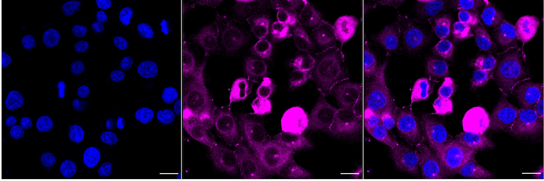 • Immunocytochemical staining of HT-1080 cells with Phospho-Vimentin (Ser72) antibody. Nuclei were stained blue with DAPI; Phospho-Vimentin (Ser72) was stained magenta with Alexa Fluor? 647. Images were taken using Leica stellaris 5. Protein abundance based on laser Intensity and smart gain: High. Scale bar, 20 μm.