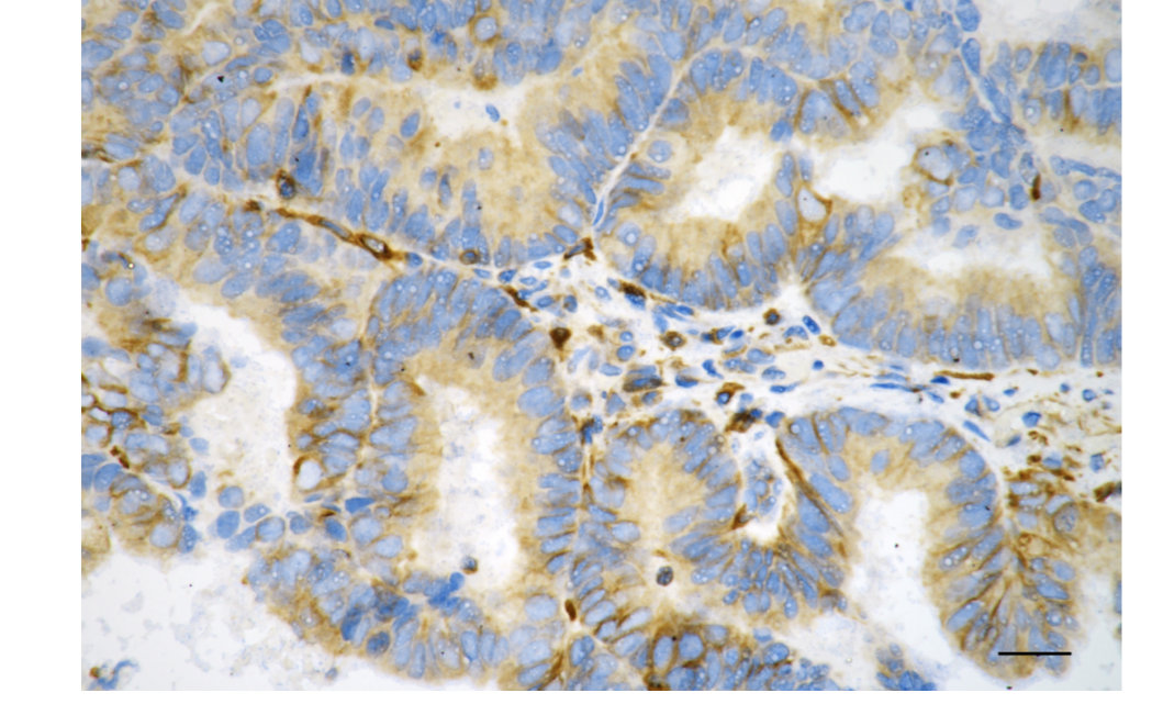 • Immunohistochemistry was performed on paraffin-embedded human endometrial carcinoma using phospho-vimentin (Ser72) antibody. Antigen retrieval was done in sodium citrate buffer (pH 6.0). DAB was used for detection, with hematoxylin counterstaining. Images were acquired using a Nikon Ci-L Plus microscope (40× objective). Scale bar: 25 μm.