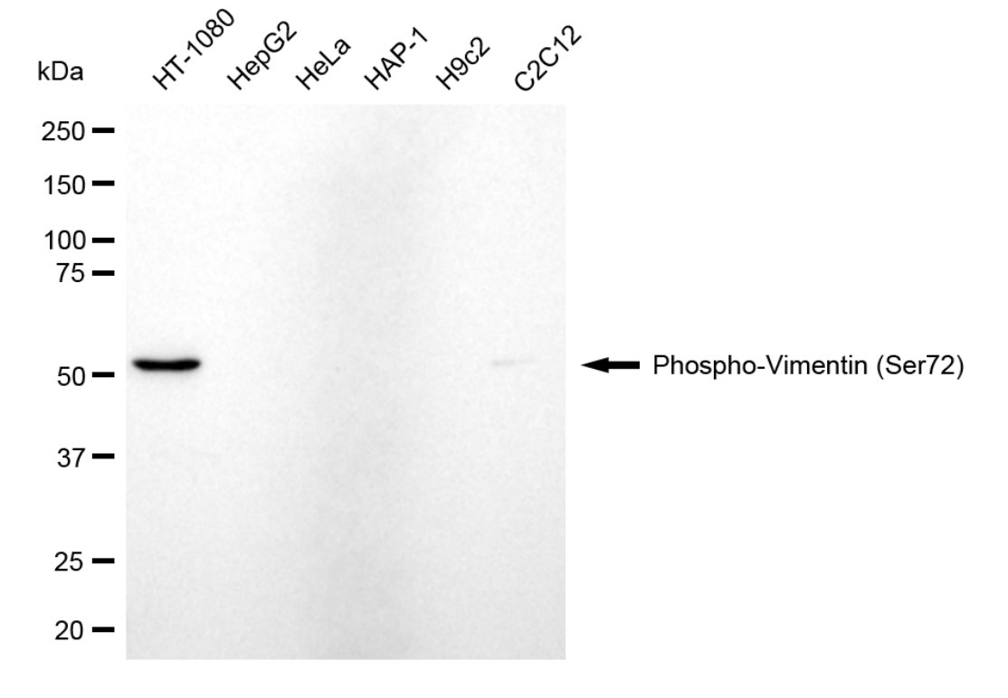 • Western blotting analysis using phospho-vimentin (Ser72) antibody. Total cell lysates (30 μg) from various cell lines were loaded and separated by SDS-PAGE. The blot was incubated with phospho-vimentin (Ser72) antibody and HRP-conjugated goat anti-rabbit secondary antibody respectively.