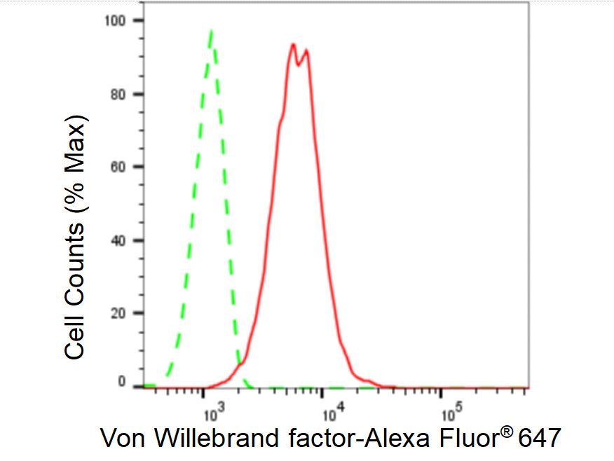 Flow cytometric analysis of Von Willebrand factor expression in C2C12 cells using Von Willebrand factor antibody (2036, 1:2,000). Green, isotype control; red, Von Willebrand factor.