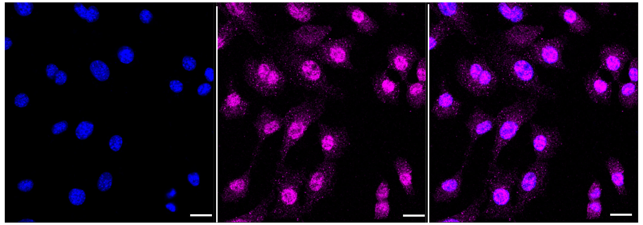 Immunocytochemical staining of C2C12 cells with Von Willebrand factor antibody. Nuclei were stained blue with DAPI; Von Willebrand factor was stained magenta with Alexa Fluor? 647. Images were taken using Leica stellaris 5. Protein abundance based on laser Intensity and smart gain: Medium. Scale bar: 20 μm.