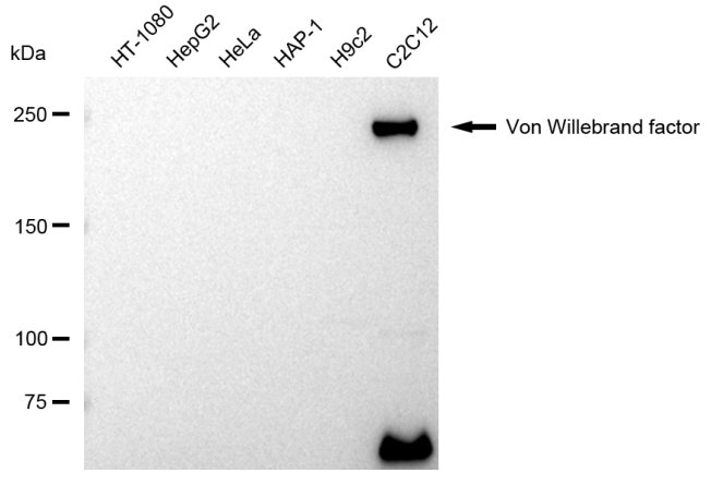 Western blotting analysis using Von Willebrand factor antibody. Total cell lysates (30 μg) from various cell lines were loaded and separated by SDS-PAGE. The blot was incubated with Von Willebrand factor antibody and HRP-conjugated goat anti-rabbit secondary antibody respectively.