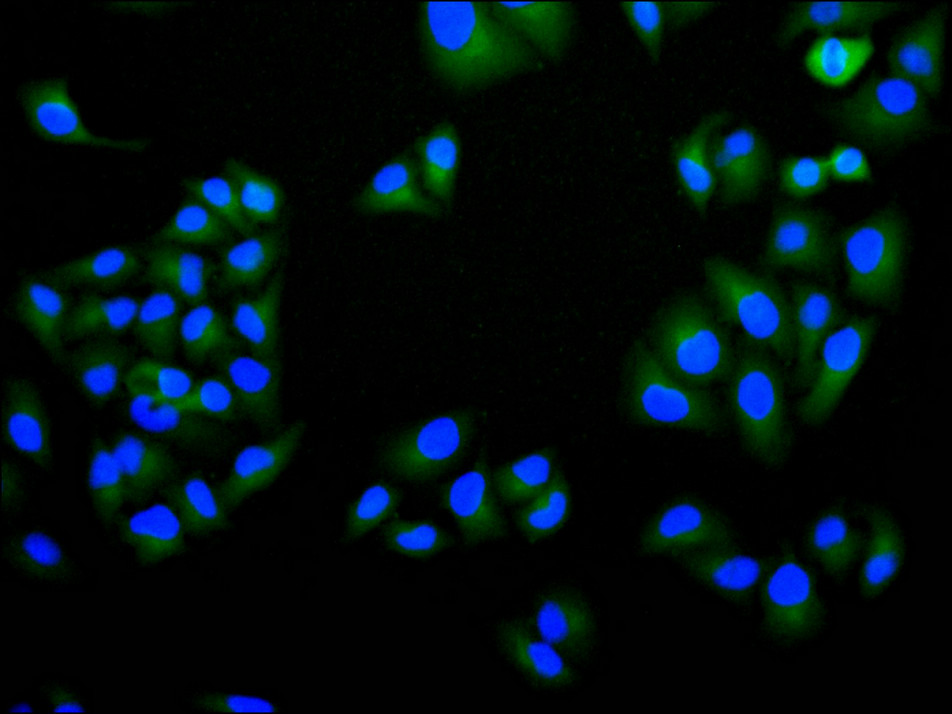 Immunofluorescence staining of Hela cell with CSB-RA953902A0HU at 1:50 , counter-stained with DAPI. The cells were fixed in 4% formaldehyde, permeabilized using 0.2% Triton X-100 and blocked in 10% normal Goat Serum. The cells were then incubated with the antibody overnight at 4°C. The secondary antibody was Alexa Fluor 488-congugated AffiniPure Goat Anti-Rabbit IgG(H+L).