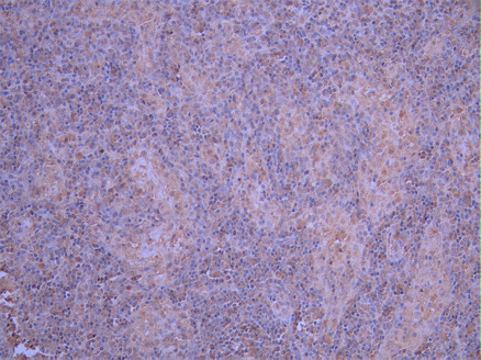 IHC image of CSB-RA953902A0HU diluted at 1:100 and staining in paraffin-embedded human lymph node tissue performed on a Leica BondTM system. After dewaxing and hydration, antigen retrieval was mediated by high pressure in a citrate buffer (pH 6.0). Section was blocked with 10% normal goat serum 30min at RT. Then primary antibody (1% BSA) was incubated at 4°C overnight. The primary is detected by a Goat anti-rabbit polymer IgG labeled by HRP and visualized using 0.05% DAB.