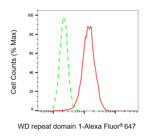 Flow cytometric analysis of WD repeat domain 1 expression in H9C2 cells using WD repeat domain 1 antibody. Green, isotype control; red, WD repeat domain 1.