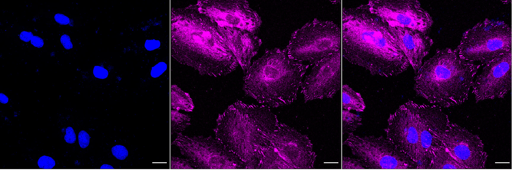Immunocytochemical staining of H9C2 cells with WD repeat domain 1 antibody. Nuclei were stained blue with DAPI; WD repeat domain 1 was stained magenta with Alexa Fluor? 647. Images were taken using Leica stellaris 5. Protein abundance based on laser Intensity and smart gain: Medium. Scale bar, 20 μm.