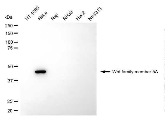Western blotting analysis using Wnt family member 5A antibody. Total cell lysates (30 μg) from various cell lines were loaded and separated by SDS-PAGE. The blot was incubated with Wnt family member 5A antibody and HRP-conjugated goat anti-rabbit secondary antibody respectively.