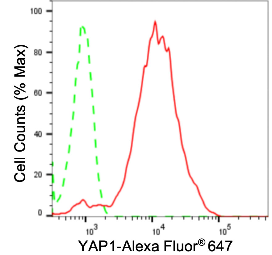 • Flow cytometric analysis of YAP1 expression in HepG2 cells using YAP1 antibody. Green, isotype control; red, YAP1.