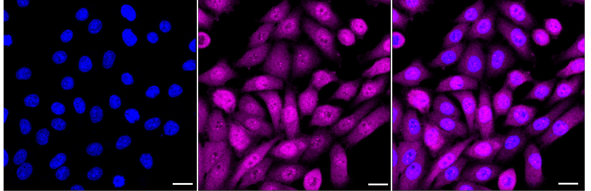 • Immunocytochemical staining of HepG2 cells with YAP1 antibody. Nuclei were stained blue with DAPI; YAP1 was stained magenta with Alexa Fluor? 647. Images were taken using Leica stellaris 5. Protein abundance based on laser Intensity and smart gain: High. Scale bar: 20 μm.