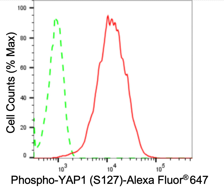 • Flow cytometric analysis of phospho-YAP1 (S127) expression in HepG2 cells using phospho-YAP1 (S127) antibody. Green, isotype control; red, phospho-YAP1 (S127).