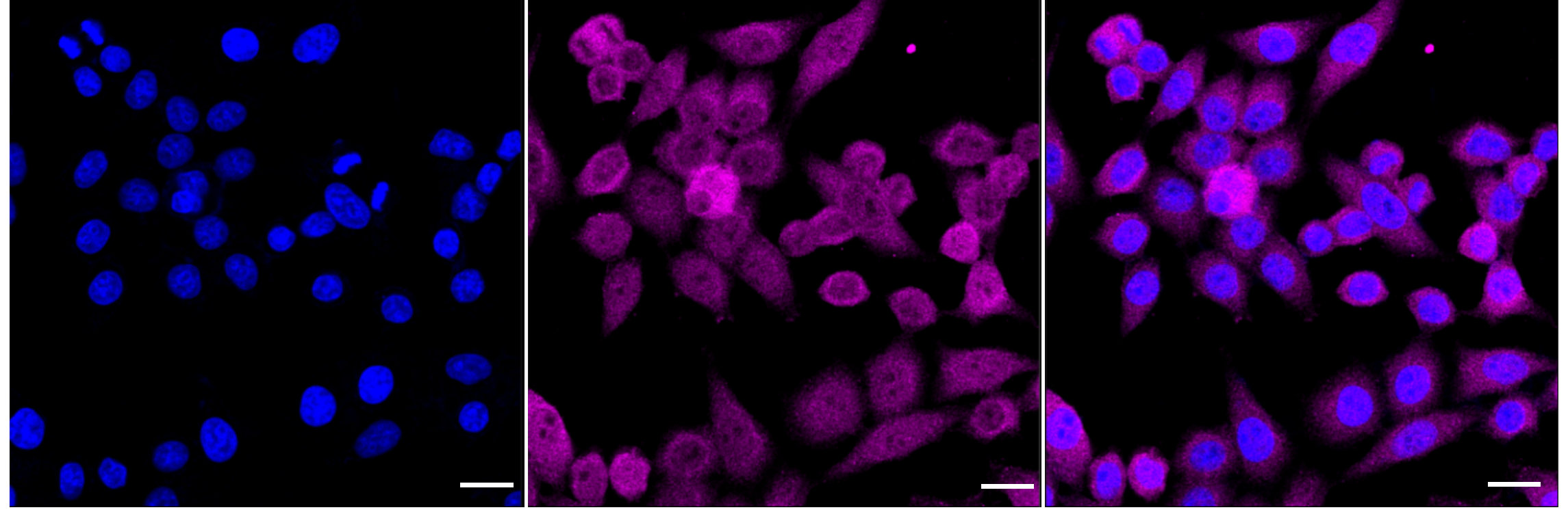 • Immunocytochemical staining of HepG2 cells with Phospho-YAP1 (S127) antibody. Nuclei were stained blue with DAPI; Phospho-YAP1 (S127) was stained magenta with Alexa Fluor? 647. Images were taken using Leica stellaris 5. Protein abundance based on laser Intensity and smart gain: High. Scale bar: 20 μm.