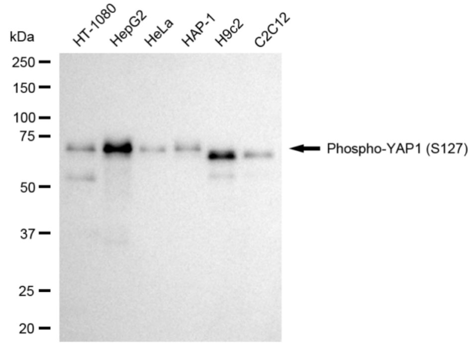 • Western blotting analysis using phospho-YAP1 (S127) antibody. Total cell lysates (30 μg) from various cell lines were loaded and separated by SDS-PAGE. The blot was incubated with phospho-YAP1 (S127) antibody and HRP-conjugated goat anti-rabbit secondary antibody respectively.