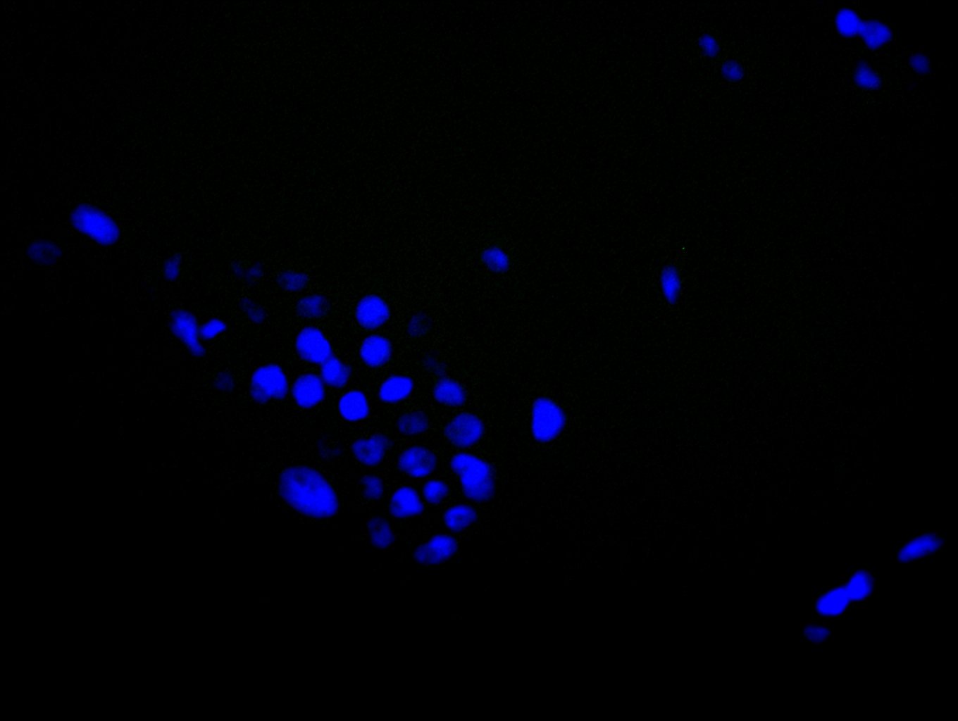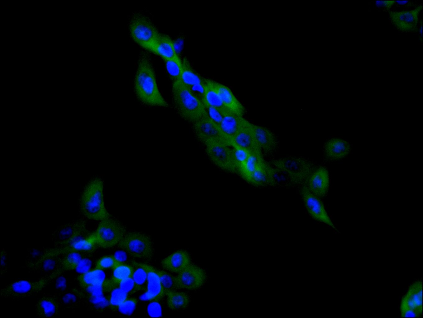 • Immunofluorescence staining of A431 cell with 5% goat serum, counter-stained with DAPI. The cells were fixed in 4% formaldehyde and blocked in 10% normal Goat Serum. The cells were then incubated with the antibody overnight at 4C. The secondary antibody was Alexa Fluor 488-congugated AffiniPure Goat Anti-Rabbit IgG(H+L).