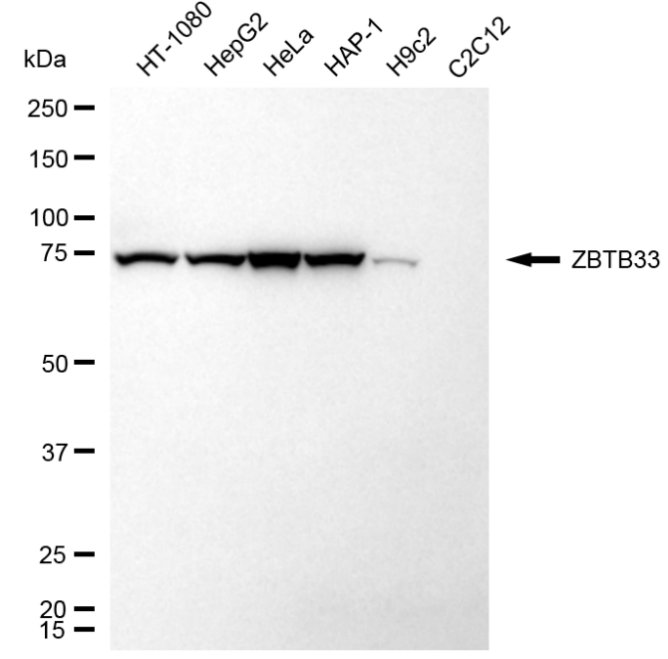 Western blotting analysis using ZBTB33 antibody. Total cell lysates (30 μg) from various cell lines were loaded and separated by SDS-PAGE. The blot was incubated with ZBTB33 antibody and HRP-conjugated goat anti-rabbit secondary antibody respectively.
