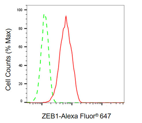 Flow cytometric analysis of ZEB1 expression in C2C12 cells using ZEB1 antibody. Green, isotype control; red, ZEB1.