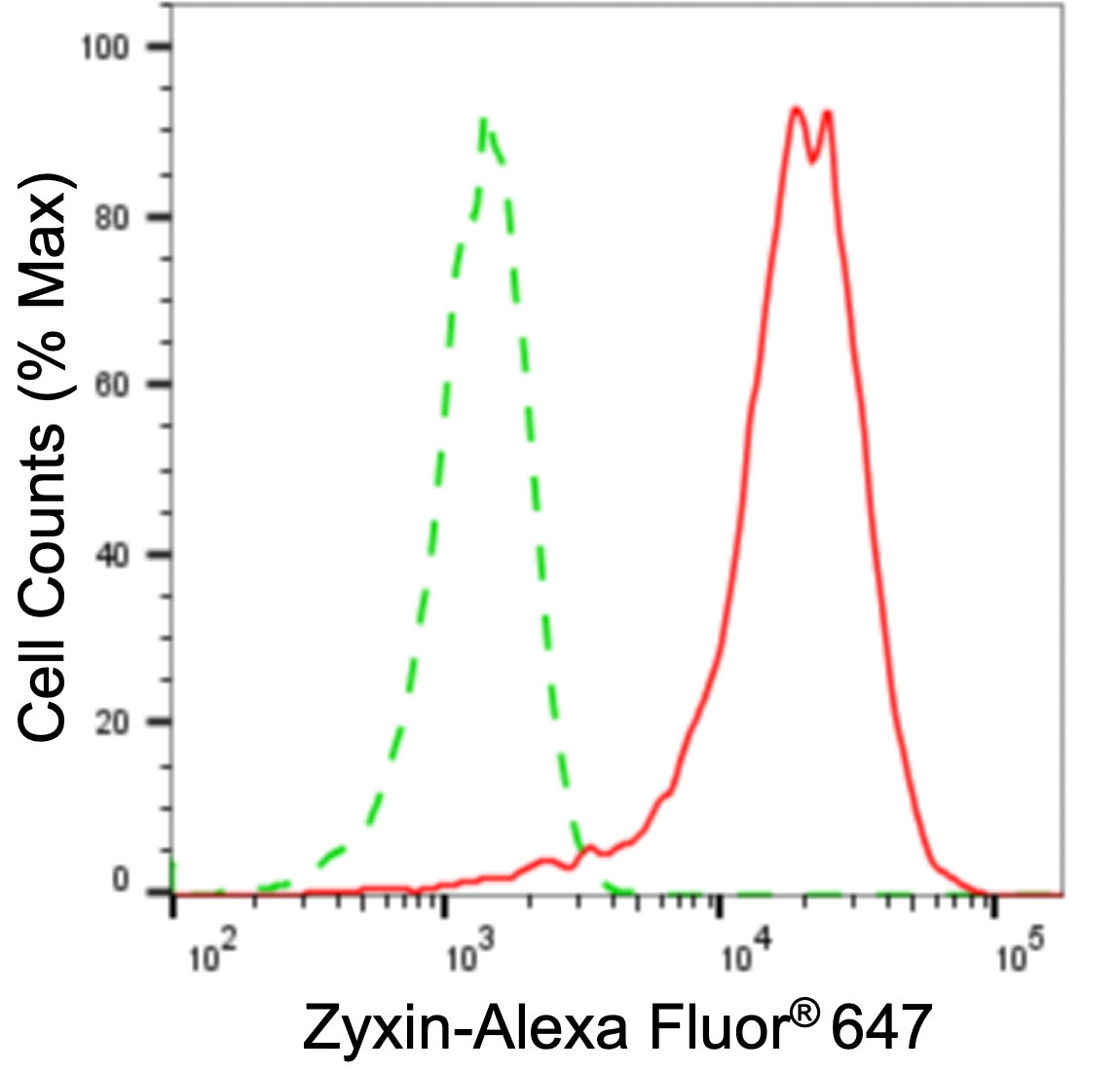 Flow cytometric analysis of zyxin expression in H9c2 cells using zyxin antibody. Green, isotype control; red, zyxin.