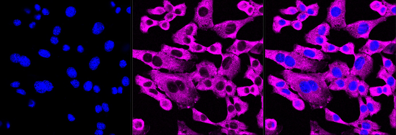 Immunocytochemical staining of C2C12 cells with Phospho-eIF4B (S406) antibody. Nuclei were stained blue with DAPI; Phospho-eIF4B (S406) was stained magenta with Alexa Fluor? 647. Images were taken using Leica stellaris 5. Protein abundance based on laser Intensity and smart gain: Medium. Scale bar, 20 μm.
