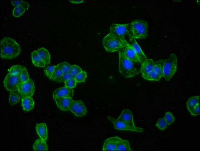 Immunofluorescence staining of HepG2 cells with CSB-RA001205A0HU at 1:60,counter-stained with DAPI. The cells were fixed in 4% formaldehyde, permeabilized using 0.2% Triton X-100 and blocked in 10% normal Goat Serum. The cells were then incubated with the antibody overnight at 4℃.The secondary antibody was Alexa Fluor 488-congugated AffiniPure Goat Anti-Rabbit IgG (H+L).