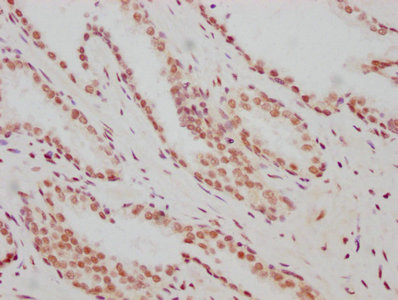 • IHC image of CSB-RA002121A0HU diluted at 1:183 and staining in paraffin-embedded human prostate cancer performed on a Leica BondTM system. After dewaxing and hydration, antigen retrieval was mediated by high pressure in a citrate buffer (pH 6.0). Section was blocked with 10% normal goat serum 30min at RT. Then primary antibody (1% BSA) was incubated at 4℃ overnight. The primary is detected by a biotinylated secondary antibody and visualized using an HRP conjugated SP system.