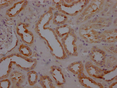 • IHC image of CSB-RA241798A0HU diluted at 1:100 and staining in paraffin-embedded human kidney tissue performed on a Leica BondTM system. After dewaxing and hydration, antigen retrieval was mediated by high pressure in a citrate buffer (pH 6.0). Section was blocked with 10% normal goat serum 30min at RT. Then primary antibody (1% BSA) was incubated at 4℃ overnight. The primary is detected by a Goat anti-rabbit IgG polymer labeled by HRP and visualized using 0.05% DAB.
