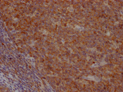 • IHC image of CSB-RA833808A0HU diluted at 1:100 and staining in paraffin-embedded human tonsil tissue performed on a Leica BondTM system. After dewaxing and hydration, antigen retrieval was mediated by high pressure in a citrate buffer (pH 6.0). Section was blocked with 10% normal goat serum 30min at RT. Then primary antibody (1% BSA) was incubated at 4℃ overnight. The primary is detected by a Goat anti-rabbit IgG polymer labeled by HRP and visualized using 0.05% DAB.