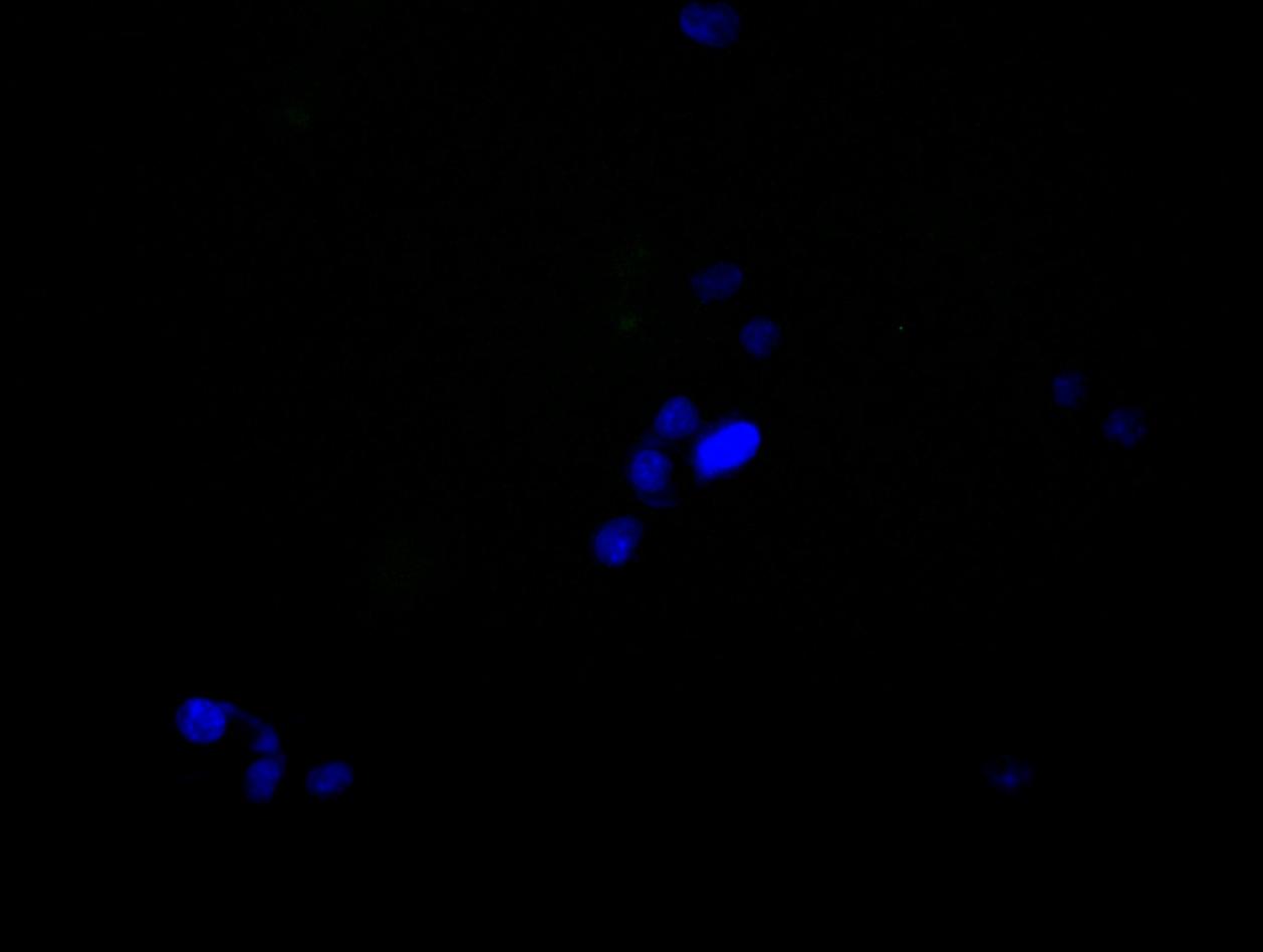 Immunofluorescence staining of Hela cell with CSB-RA010605A0HU at 1:30, counter-stained with DAPI. The cells were fixed in 4% formaldehyde and blocked in 10% normal Goat Serum. The cells were then incubated with the antibody overnight at 4C. The secondary antibody was Alexa Fluor 488-congugated AffiniPure Goat Anti-Rabbit IgG(H+L).