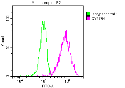 • Overlay histogram showing HepG2 cells stained with CSB-RA632595A0HU (red line) at 1:50. The cells were fixed with 70% Ethylalcohol (18h) and then incubated in 10% normal goat serum to block non-specific protein-protein interactions followedby the antibody (1μg/1*106 cells) for 1 h at 4℃.The secondary antibody used was FITC-conjugated goat anti-rabbit IgG (H+L) at 1/200 dilution for 30min at 4℃. Control antibody (green line) was Rabbit IgG (1μg/1*106 cells) used under the same conditions. Acquisition of >10,000 events was performed.