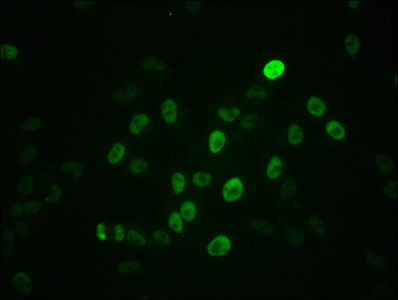 Immunofluorescence staining of Hela cells with CSB-RA015270A62phHU at 1:100,counter-stained with DAPI. The cells were fixed in 4% formaldehyde, permeabilized using 0.2% Triton X-100 and blocked in 10% normal Goat Serum. The cells were then incubated with the antibody overnight at 4℃. The secondary antibody was Alexa Fluor 488-congugated AffiniPure Goat Anti-Rabbit IgG (H+L).