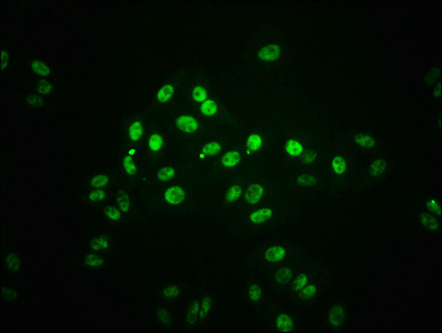 Immunofluorescence staining of HepG2 cells(treated with 100mM Calyculin A for 30min) with CSB-RA022810A727phHU at 1:66,counter-stained with DAPI. The cells were fixed in 4% formaldehyde, permeabilized using 0.2% Triton X-100 and blocked in 10% normal Goat Serum. The cells were then incubated with the antibody overnight at 4℃. The secondary antibody was Alexa Fluor 488-congugated AffiniPure Goat Anti-Rabbit IgG (H+L).