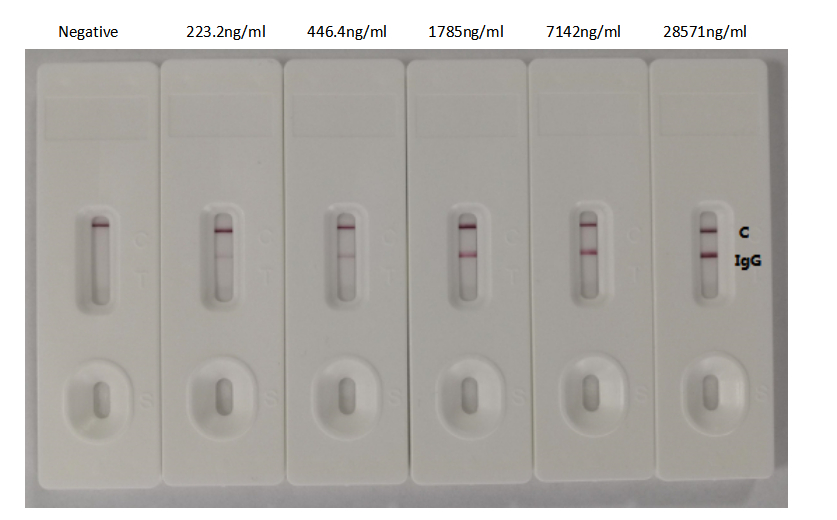 In the Colloidal Gold Immunochromatography Assay detection system, the background of antibody (CSB-RA33245A1GMY) is clean, the detection limit can be as low as 223.2ng/ml (15.625ng/0.07ml), and the sensitivity is very good.