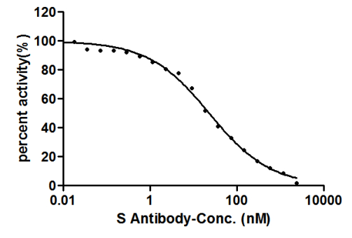 Binding signal of SARS-CoV-2-S1-RBD (CSB-YP3324GMY1) and ACE2 protein-HRP conjugate (CSB-MP866317HU) was inhibited by S Antibody (CSB-RA33245A1GMY) with the IC50 is 23.32 nM.