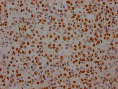 • IHC image of CSB-RA102629A0HU diluted at 1:100 and staining in paraffin-embedded human glioma cancer performed on a Leica BondTM system. After dewaxing and hydration, antigen retrieval was mediated by high pressure in a citrate buffer (pH 6.0). Section was blocked with 10% normal goat serum 30min at RT. Then primary antibody (1% BSA) was incubated at 4℃ overnight. The primary is detected by a Goat anti-rabbit IgG polymer labeled by HRP and visualized using 0.05% DAB.