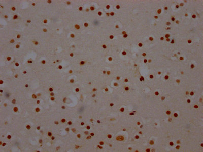 • IHC image of CSB-RA102629A0HU diluted at 1:100 and staining in paraffin-embedded human brain tissue performed on a Leica BondTM system. After dewaxing and hydration, antigen retrieval was mediated by high pressure in a citrate buffer (pH 6.0). Section was blocked with 10% normal goat serum 30min at RT. Then primary antibody (1% BSA) was incubated at 4℃ overnight. The primary is detected by a Goat anti-rabbit IgG polymer labeled by HRP and visualized using 0.05% DAB.