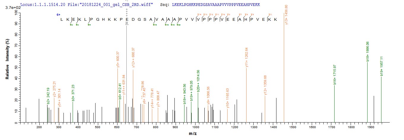 Based on the SEQUEST from database of E.coli host and target protein, the LC-MS/MS Analysis result of CSB-EP337202DOA could indicate that this peptide derived from E.coli-expressed Arabidopsis thaliana (Mouse-ear cress) ERD14.