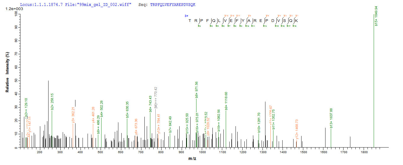 Based on the SEQUEST from database of E.coli host and target protein, the LC-MS/MS Analysis result of CSB-EP736184CA could indicate that this peptide derived from E.coli-expressed Felis catus (Cat) (Felis silvestris catus) Fel d 4.