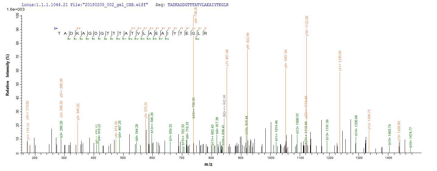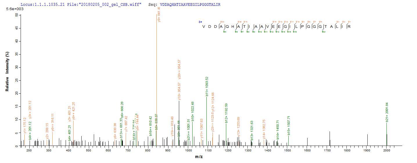 Based on the SEQUEST from database of E.coli host and target protein, the LC-MS/MS Analysis result of CSB-EP314770DSB could indicate that this peptide derived from E.coli-expressed Chlamydia trachomatis (strain D/UW-3/Cx) groL.