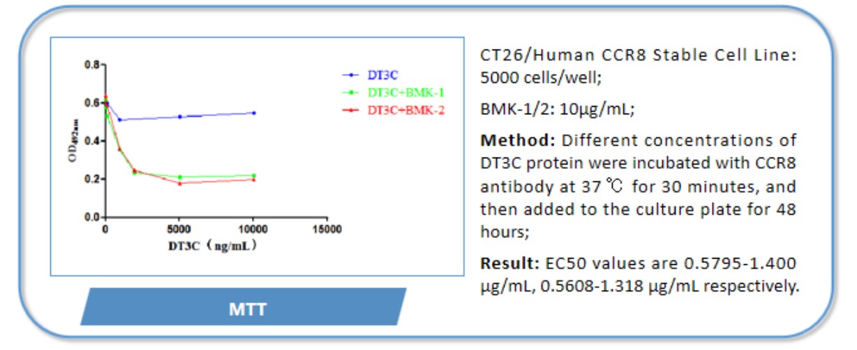 After DT3C 10μg/ml formed complexes with different concentrations of Anti-CCR8 antibodies (CSB-RA004847MA3HU), cytotoxicity experiments were conducted on CHOK1/Human CCR8 cells (CSB-SC004847HU2). The ED50 is 0.3708-0.5608 μg/ml. Biological Activity Assay -