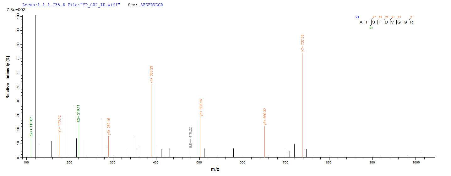 Based on the SEQUEST from database of Yeast host and target protein, the LC-MS/MS Analysis result of CSB-YP365448ENL could indicate that this peptide derived from Yeast-expressed Escherichia coli hph.