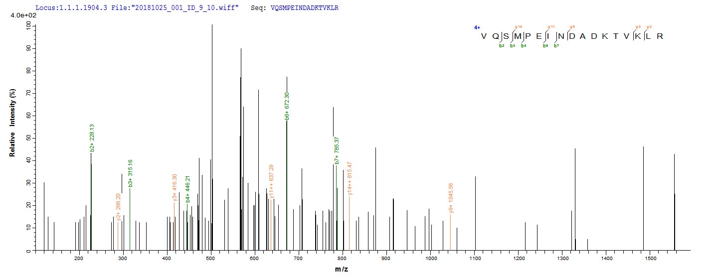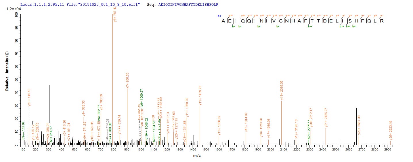 Based on the SEQUEST from database of E.coli host and target protein, the LC-MS/MS Analysis result of CSB-EP364271ENV1 could indicate that this peptide derived from E.coli-expressed Escherichia coli (strain K12) bamA.