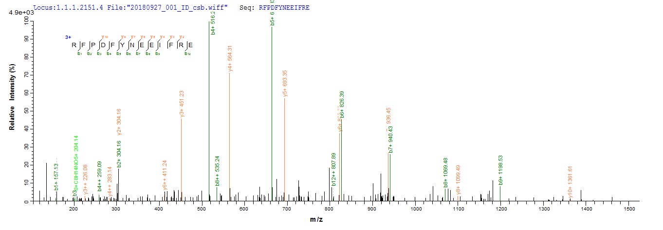 Based on the SEQUEST from database of E.coli host and target protein, the LC-MS/MS Analysis result of CSB-EP319205ENL could indicate that this peptide derived from E.coli-expressed Escherichia coli traY.