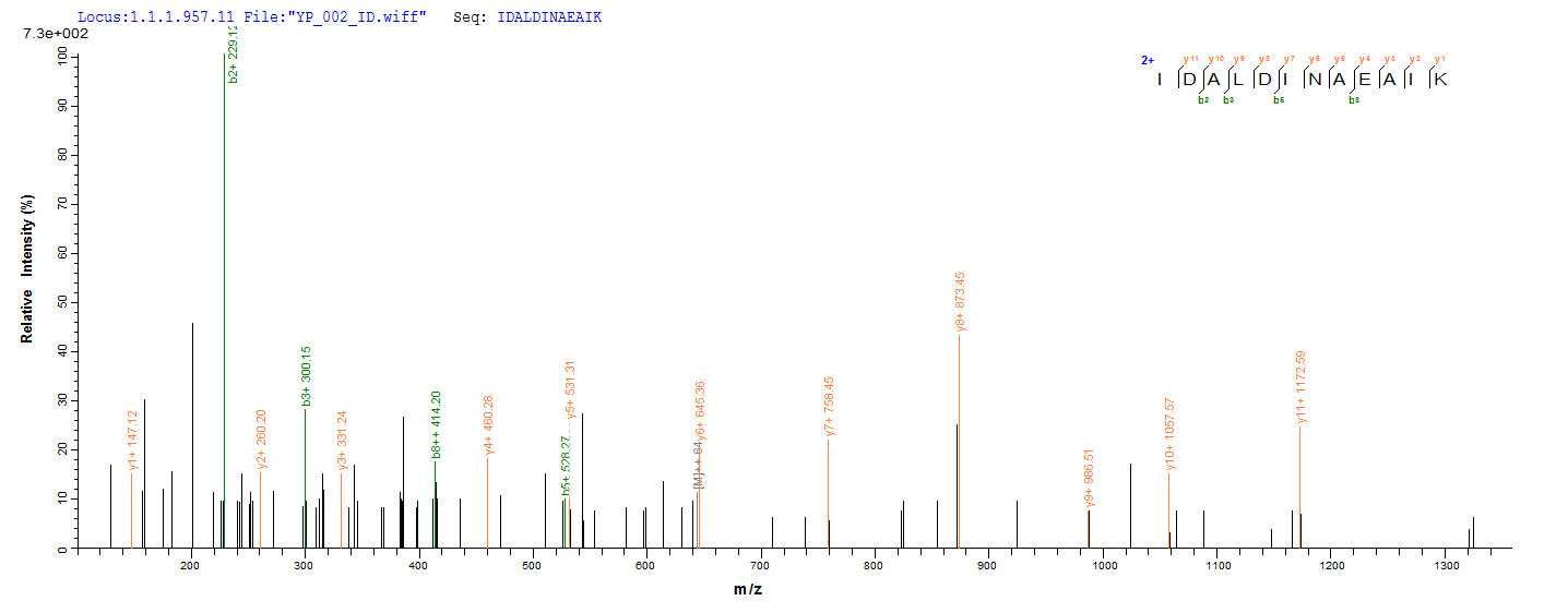 Based on the SEQUEST from database of Yeast host and target protein, the LC-MS/MS Analysis result of CSB-YP333053GHL could indicate that this peptide derived from Yeast-expressed Gardnerella vaginalis 5-1 GV51_0914.