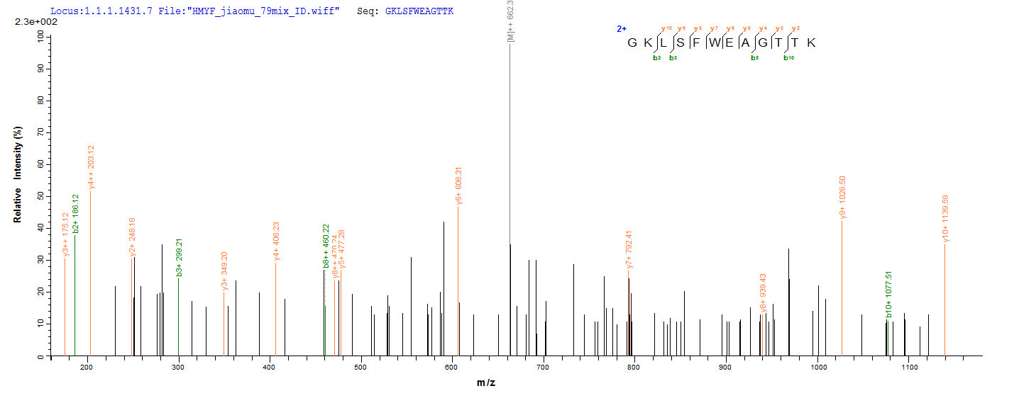 Based on the SEQUEST from database of Yeast host and target protein, the LC-MS/MS Analysis result of CSB-YP897430HHAM could indicate that this peptide derived from Yeast-expressed Hepatitis E virus genotype 3 (isolate Human/United States/US2) (HEV-3) ORF2.