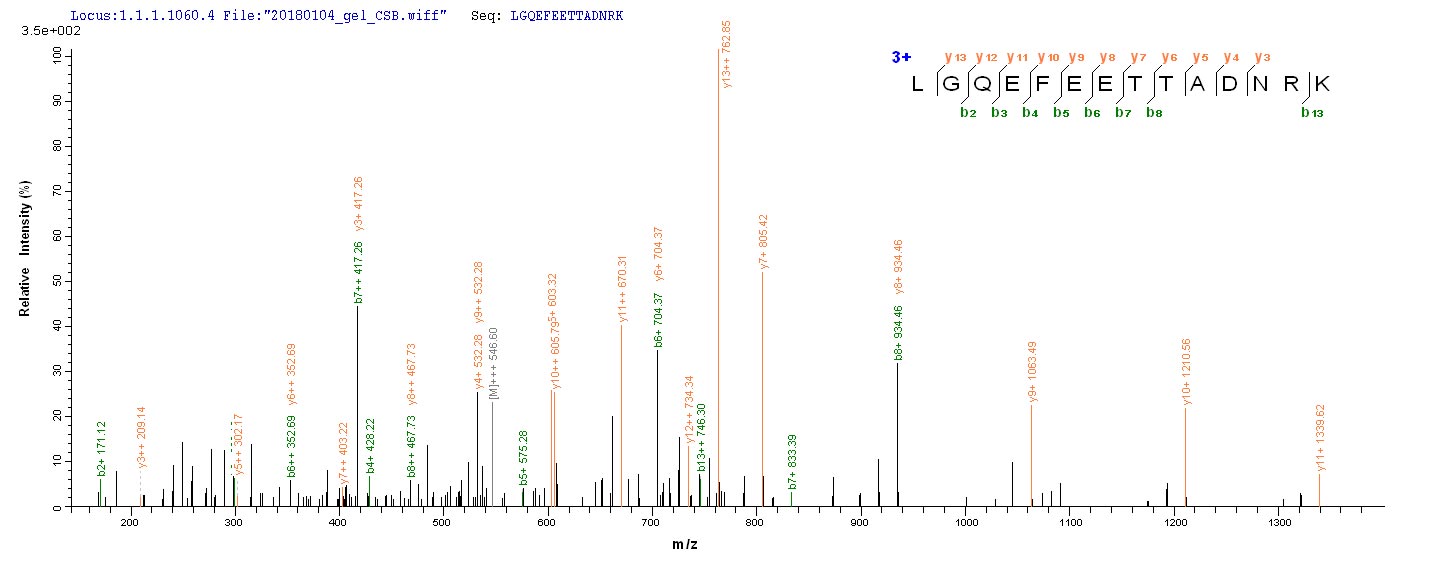 Based on the SEQUEST from database of E.coli host and target protein, the LC-MS/MS Analysis result of CSB-EP315130HO could indicate that this peptide derived from E.coli-expressed Equus caballus (Horse) PMP2.