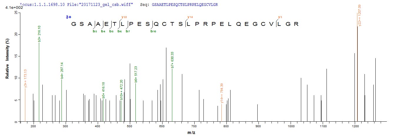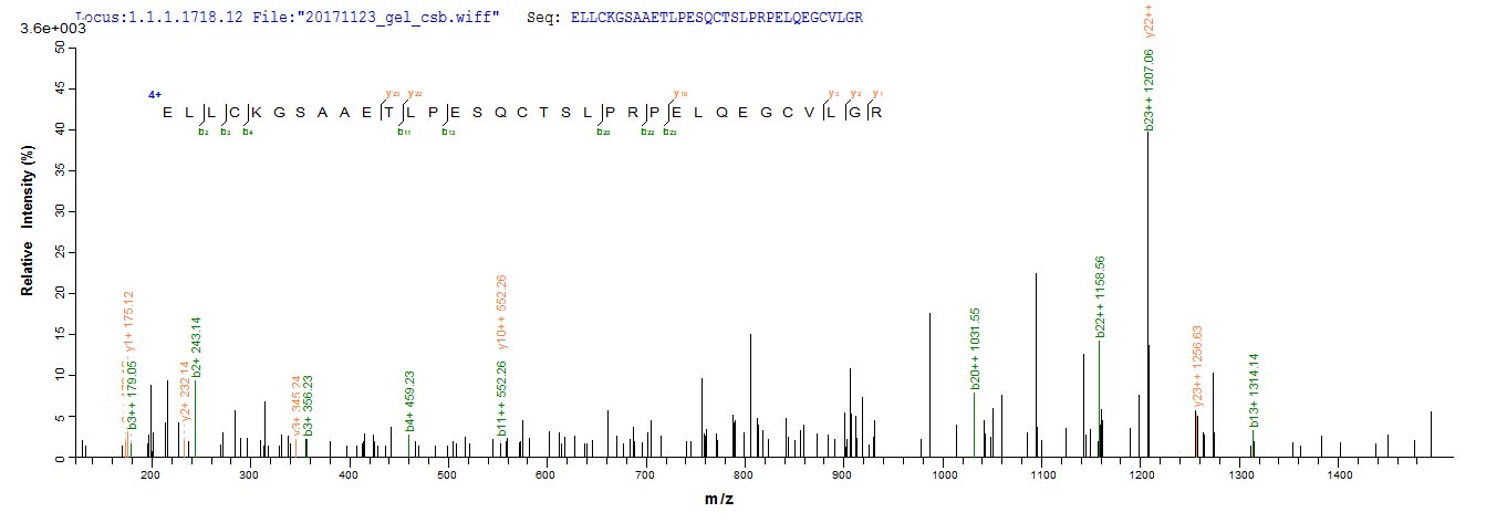 Based on the SEQUEST from database of E.coli host and target protein, the LC-MS/MS Analysis result of CSB-EP851556HU could indicate that this peptide derived from E.coli-expressed Homo sapiens (Human) ADAMTS18.