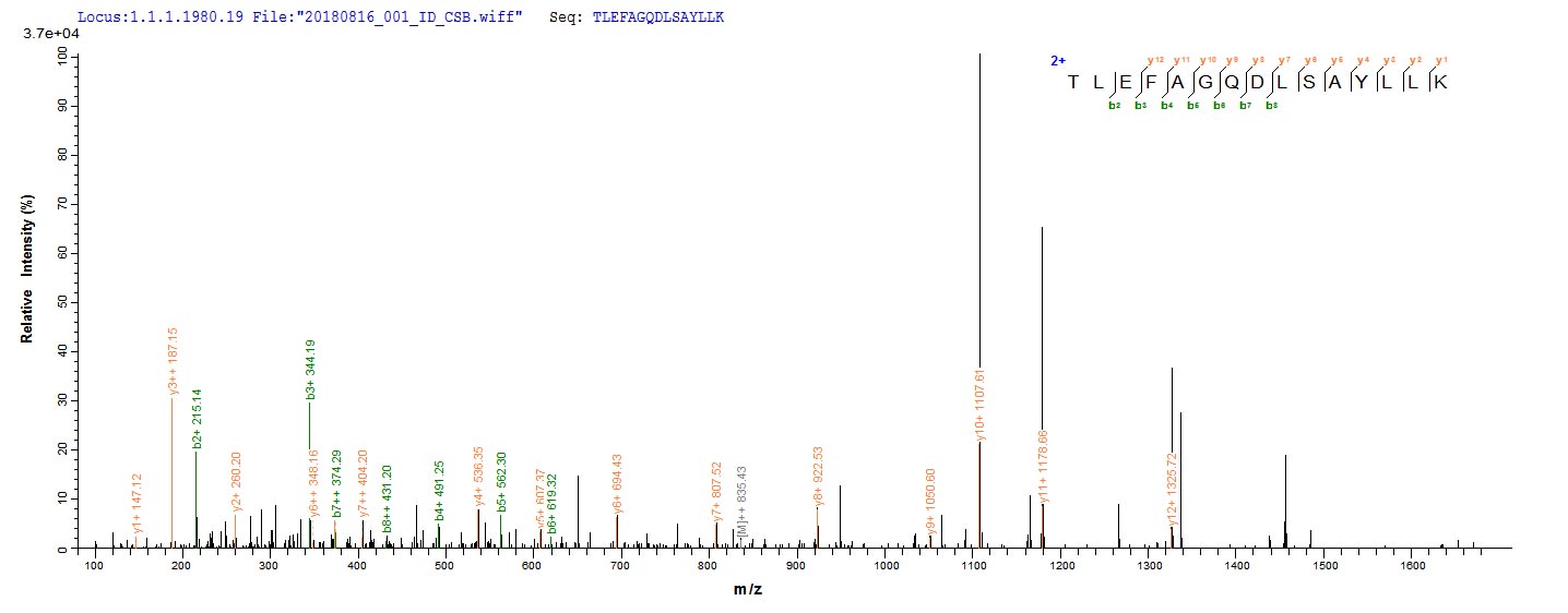 Based on the SEQUEST from database of Yeast host and target protein, the LC-MS/MS Analysis result of CSB-YP887982HU could indicate that this peptide derived from Yeast-expressed Homo sapiens (Human) ACTL8.