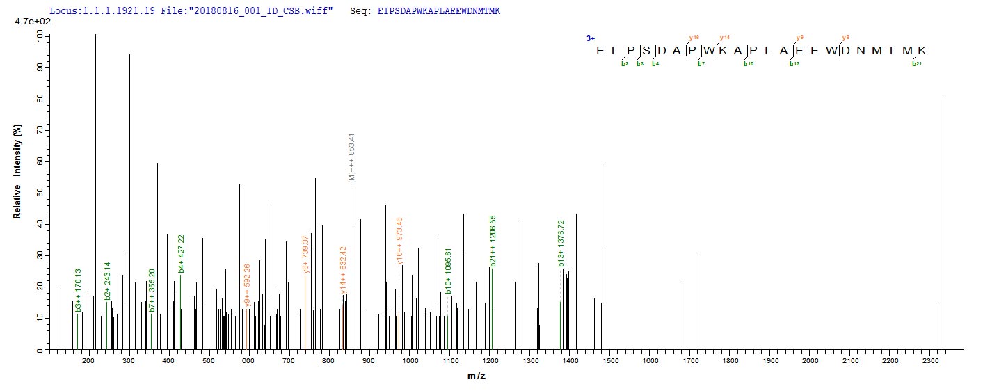 Based on the SEQUEST from database of E.coli host and target protein, the LC-MS/MS Analysis result of CSB-EP013399HU could indicate that this peptide derived from E.coli-expressed Homo sapiens (Human) MAOB.