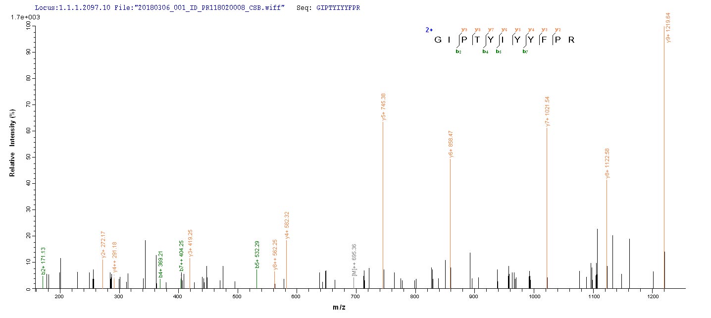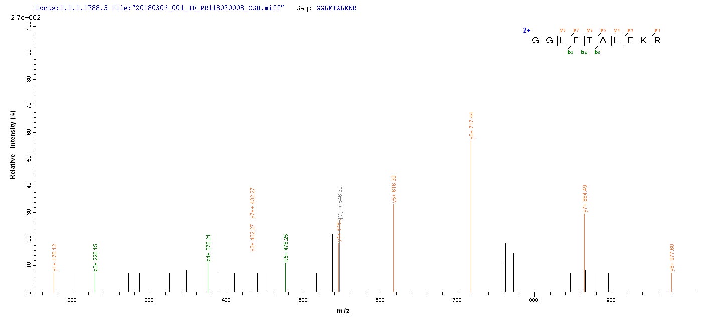 Based on the SEQUEST from database of E.coli host and target protein, the LC-MS/MS Analysis result of CSB-EP803136HU could indicate that this peptide derived from E.coli-expressed Homo sapiens (Human) CHD1L.